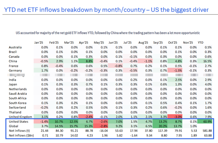 进一步细分数据可以发现,美国投资者是这轮上涨的主力军。根据报告,2025年迄今,美国市场的黄金ETF净流入占全球总量的60.9%。