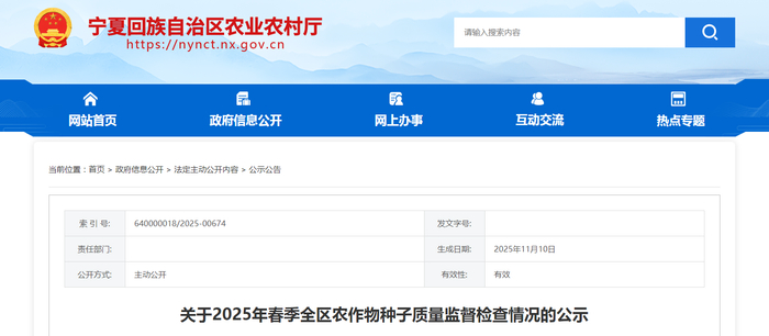 宁夏农业农村厅公布2025年春季全区农作物种子质量监督检查情况