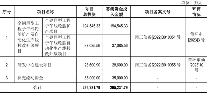 本此拟募资用途:项目总投资资金29.52亿,其中19.45用于全钢巨型工程 子午线轮胎扩 产项目,3.71亿用于全钢巨型工程 子午线轮胎自 动化生产线技 改升级项目,2.86亿用于研发中心建设项目,3.5亿用于补充流动资金,具体项目如下: