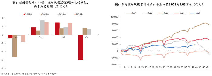 1、银行理财:2025年看,存款脱媒趋势延续,Q3规模增长迅速;资金向固收+搬家利好中高等级中短久期信用债,曲线陡峭化。展望2026年,多资产多策略成为共识,净值化后规模增长速度再放缓。
