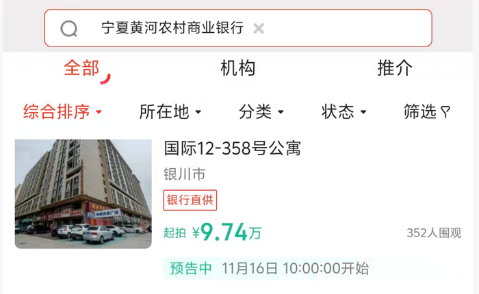 宁夏黄河农村商业银行即将拍卖一套位于银川市永宁县的公寓,面积55.66平方米,起拍价仅9万余元。