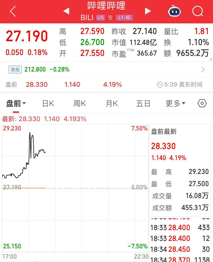 市场方面,哔哩哔哩美股盘前一度涨超7%,现涨4.19%。