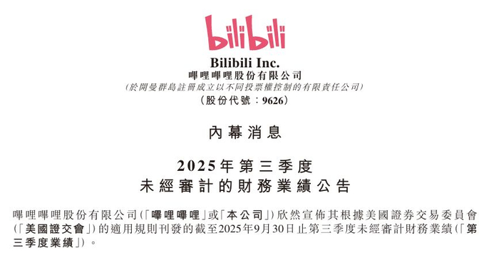 11月13日,哔哩哔哩公告,2025年第三季度净营业额总额为人民币76.9亿元,同比增长5%。其中,广告营业额为人民币25.7亿元,同比增长23%。毛利润为人民币28.2亿元,同比增长11%,毛利率达36.7%。