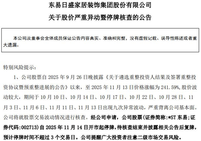 《每日经济新闻》记者注意到,10月以来,*ST东易已九次发布异动公告。公司称,自2025年9月26日晚披露《关于遴选重整投资人结果及签署重整投资协议暨预重整进展的公告》以来至11月13日收盘,公司股价累计涨幅达241.59%,严重背离公司基本面。公司提醒广大投资者注意二级市场交易风险。