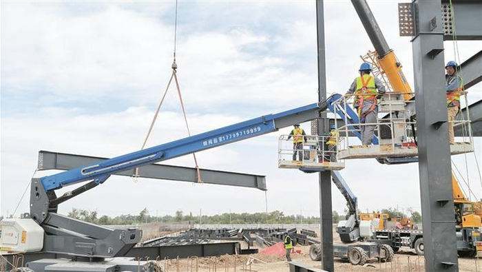 在十二师五一农场高达科技跨境电商航空物流园项目建设现场,施工人员进行钢结构吊装作业(资料图片)。今年前三季度,十二师抓实项目引进和落地开工,抓细项目要素保障和服务,确保重大项目早落地早建成早投产。 兵团日报常驻记者 田园 摄