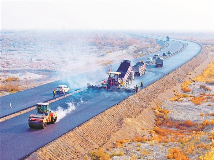 五师双河市—九○团—精阿高速公路项目施工现场(资料图片)。今年前三季度,五师双河市持续扩大交通有效投资,打造“四横四纵”市域交通主通道,提升多式联运效率与物流综合服务水平,形成连通博乐市、阿拉山口市、精河县的“1小时交通圈”。秦桂连 摄