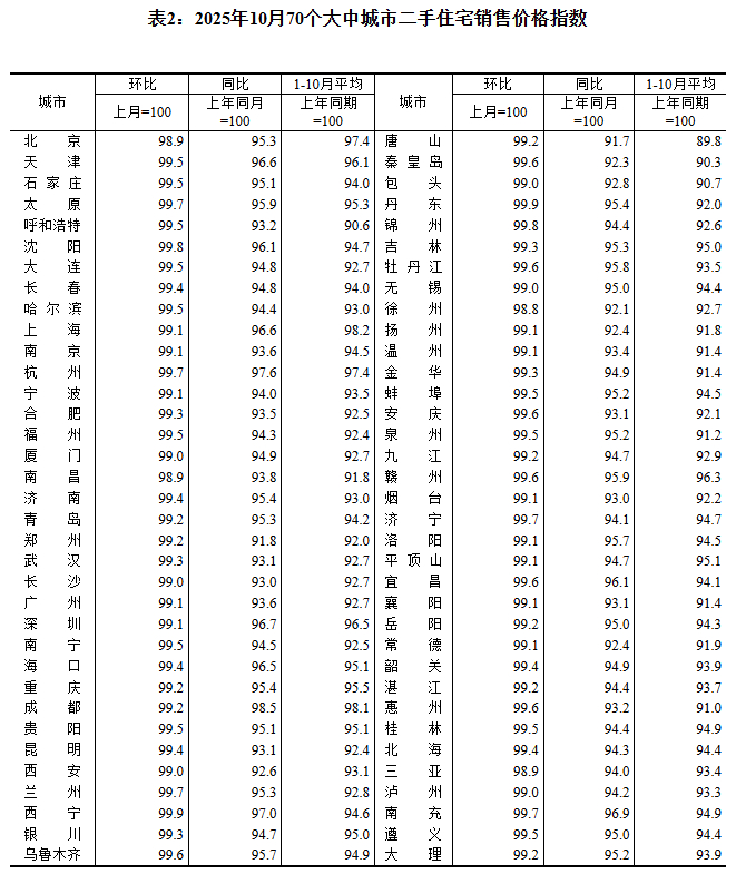 2025年10月份,70个大中城市中,各线城市商品住宅销售价格环比和同比均下降。