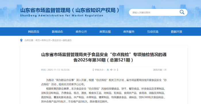 山东省市场监督管理局关于食品安全“你点我检”专项抽检情况的通告2025年第30期(总第521期)