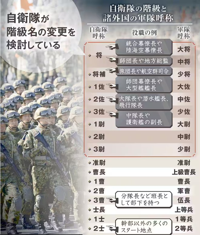 日本国防部内部也有人反对这项变更,他们认为“现行名称已经确立”。过去,政府和执政党内部也曾讨论过更改军衔和职级名称的问题。