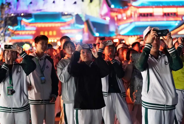 11月11日晚上,北京中学生千人研学团在武当山下“武当一梦”沉浸式演艺主题园区观看《大话武当》演出,并在室外观赏无人机和烟花表演,现场气氛热烈。其间无人机在天空中摆出“京堰研学 惊艳之旅”字样,引发学生欢呼。