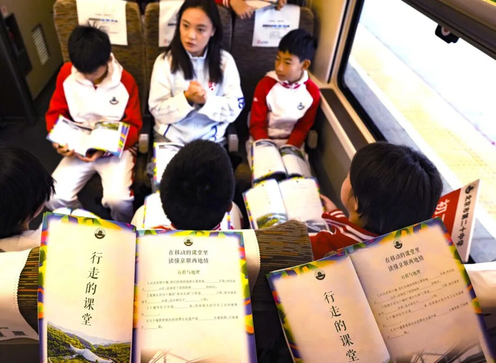 在列车行进中,北京市第二十中学教育集团校长董红军的音频课娓娓动听讲述南水北调大国工程。