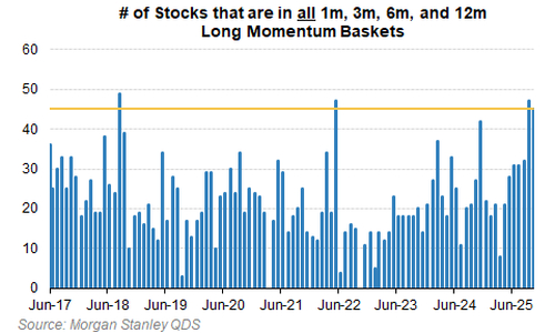 首先是“拥挤风险”空前。目前,同时出现在1个月、3个月、6个月和12个月动量多头组合中的股票数量达到45只,这种高度重叠的状况历史上仅出现过两次(2018年9月和2022年6月),而这两次之后动量股均在未来1至3个月内持续走弱。