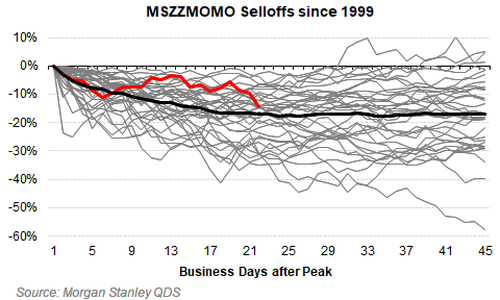 更值得关注的是,这轮由强势股领跌的抛售行情目前已持续21个交易日,正在接近约25个交易日的历史平均时长。