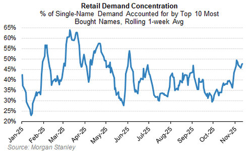 这意味着,在总流入资金规模不变的情况下,流向市值较小、尚未盈利的投机性股票的资金正在减少。这种资金轮动已经对“散户青睐股”组合造成了冲击,该组合既包含大型科技股,也囊括了比特币矿商等投机性主题。自10月15日以来,该组合的表现已落后纳斯达克100指数约15%。如果散户资金流入放缓,或继续保持高度集中,即使没有出现大规模抛售,投机性较强和动量属性较重的股票也将持续承压。
