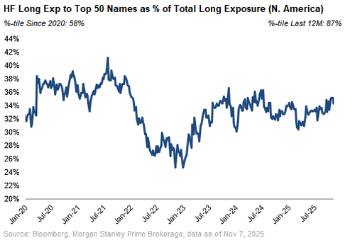 市场面临的一个核心风险在于,对冲基金和散户投资者的仓位都高度集中。根据MS PB Content的数据,对冲基金的多头杠杆水平处于过去五年来的第98个百分位,接近2006年以来的峰值。此外,其多头持仓的集中度也仅从近期高点小幅回落,仍处于过去一年中的第87个百分位。