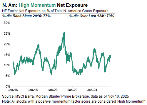 尽管近期对冲基金一直在抛售人工智能和科技、媒体与电信等热门板块,转而买入医疗保健等持仓较少的领域,但其整体风险敞口并未显著降低。对冲基金在动量股上的净敞口,仍处于过去一年的第79个百分位。