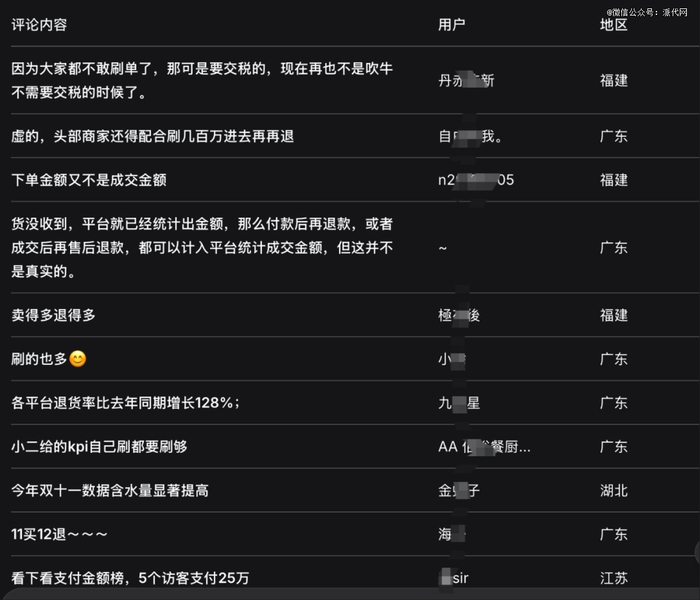 “假数据”、“自己骗自己”——这些来自广东、浙江等多地商家的尖锐评论,直接点破了公众的普遍疑虑。有商家指出:“下单金额又不是成交金额”,道破了平台可能将未经历退货周期的所有订单都计入销售额的行业“潜规则”。更有商家揭露,为了达成平台下达的KPI,“头部商家还得配合刷几百万进去再退”,这种为求表面繁荣的刷单行为,进一步扭曲了数据的真实性。