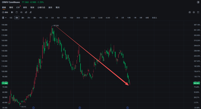 CoreWeave股价今年早期曾大幅上涨,该股自6月底以来已暴跌近53%。