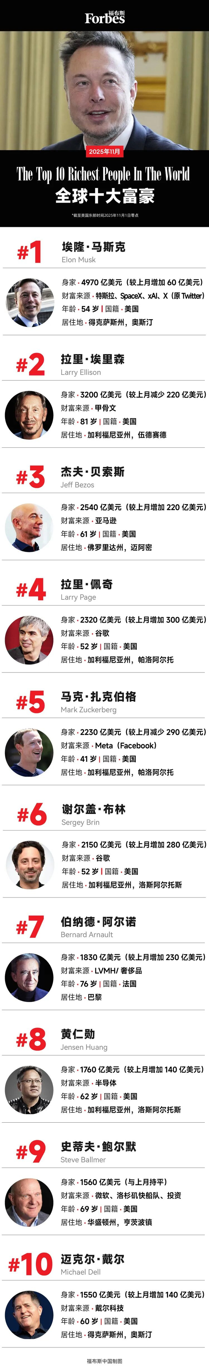 自1987年以来,《福布斯》持续追踪全球亿万富豪。2025年4月,我们的年度亿万富豪榜共统计了3028位亿万富豪。以下是据《福布斯》统计,截至美国东部时间2025年11月1日午夜12:00的全球十大富豪。他们的总身家合计为2.4万亿美元,自9月以来增加了1000亿美元。(由于股价经常波动,他们的身家可能每天都在变化,《福布斯》另有实时亿万富豪榜追踪富豪们的每日财富变化。)