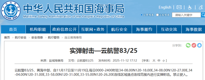 云航警83/25,黄海中部,自11月17日至11月19日,每日0000-2400时在34-08.00N120-18.00E,34-08.00N120-27.00E,34-04.00N120-31.00E,33-58.00N120-31.00E,33-55.00N120-26.20E连线区域诸点连线范围内进行实弹射击。禁止驶入。