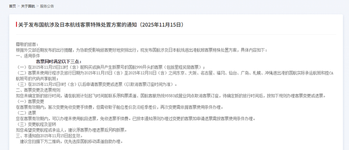 根据外交部近期发布的出行提醒,为协助受影响旅客更好地安排出行,现发布国航涉及日本航线进出港航班客票特殊处置方案,具体内容如下: