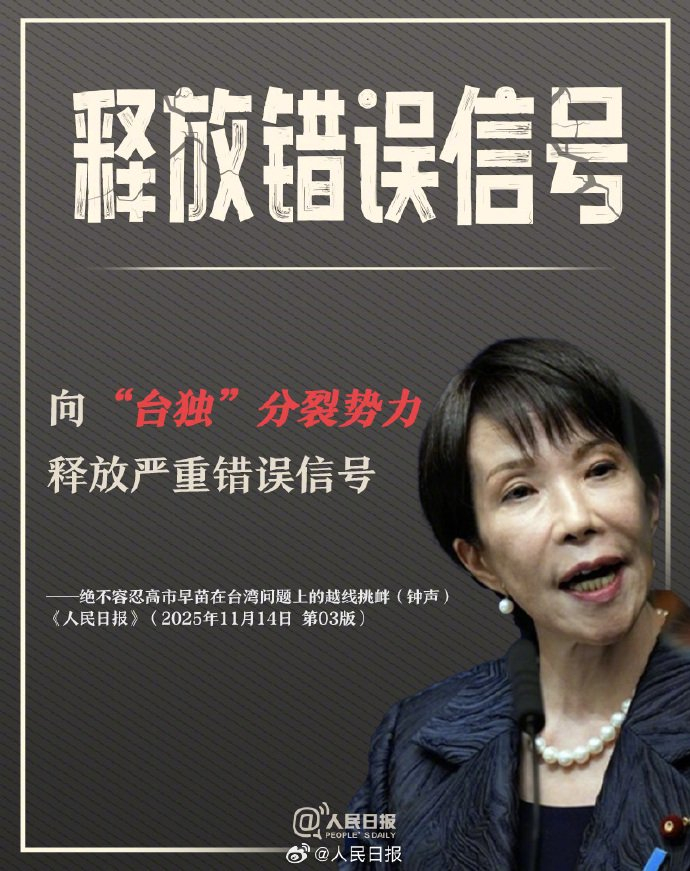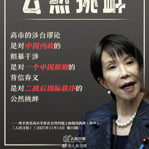 日本首相高市早苗的涉台谬论,是对中国内政的粗暴干涉,是对一个中国原则的背信弃义,是对二战后国际秩序的公然挑衅。玩火者必自焚,任何企图阻挠中国统一大业的势力都是螳臂当车,必将遭到坚决反制和彻底失败!高市搞事怎么看?详戳↓↓