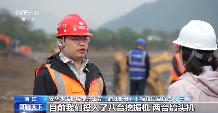 安华水库扩容提升工程(浦江部分)Ⅱ标段项目负责人 于秦:目前我们投入八台挖掘机,两台镐头机,主要是为了保证非汛期的黄金施工期,为后续汛期水面以上的施工做准备。
