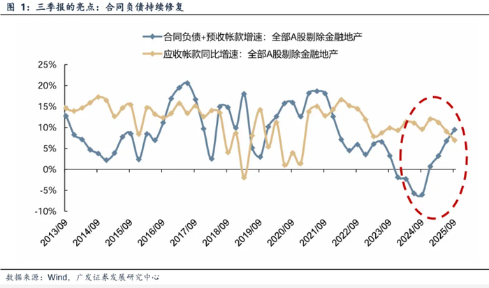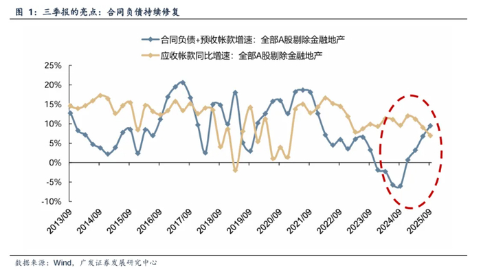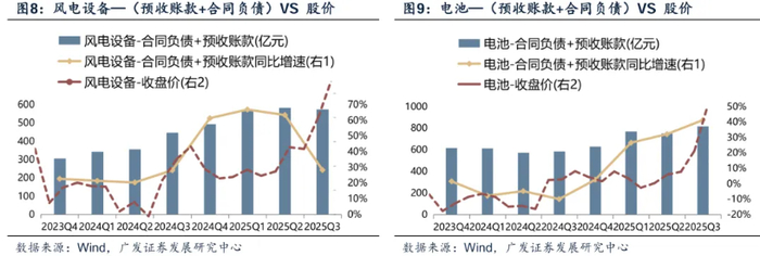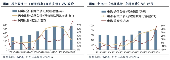 其中,以一季报与中报均入选的风电设备、电池行业为例,这两个制造业的“合同负债+预收账款”总额自2025年第一季度迎来了同比放量增长,并在随后持续保持在高位。