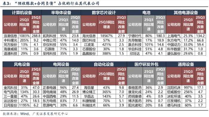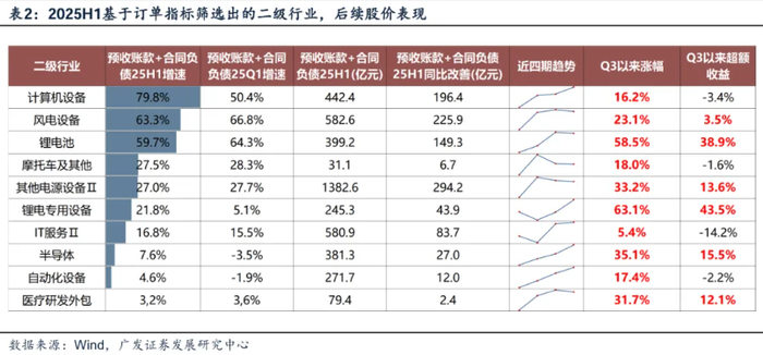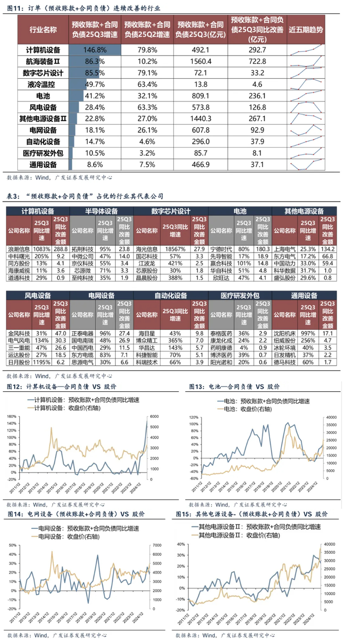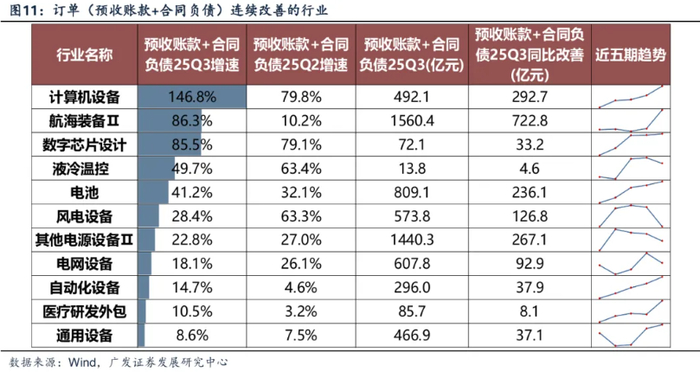 我们进一步考察三季报,筛选近几个季度订单增速连续改善&25Q3订单增速同比高增的行业如下表:计算机设备、船舶、数字芯片设计、液冷温控、电池、风电设备、半导体设备、其他电源设备、电网设备、自动化设备、医疗研发外包、通用设备等。