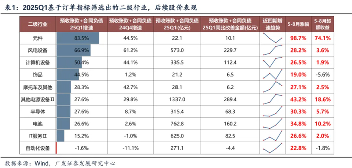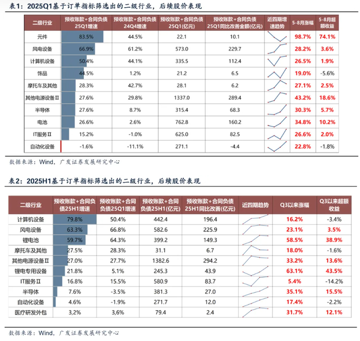一季度,我们基于订单连续高增改善筛选出了代表行业如元件(PCB)、风电设备、计算机设备(服务器)等,中报我们同理可以筛选出了锂电池、电源设备、锂电设备等,大多数在后续的市场表现中实现了绝对上涨与超额收益。