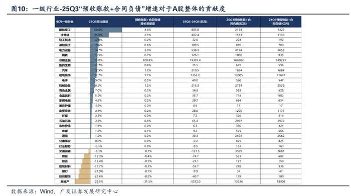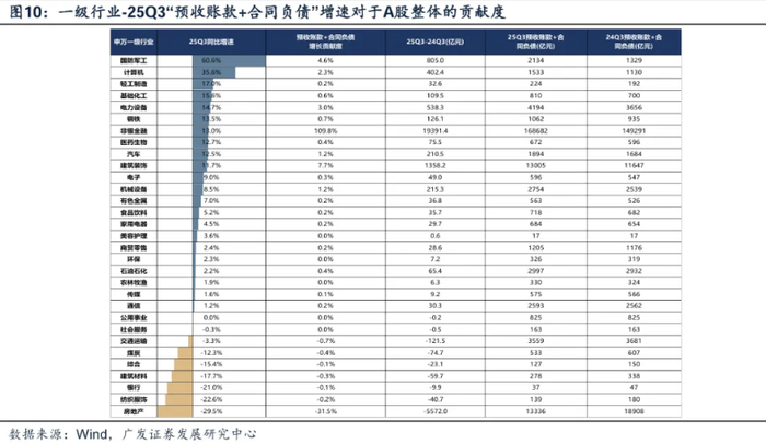 三季报A股【预收账款+合同负债】同比增速继续大幅改善,其中三季报同比增速较高、增长贡献度较高的一级行业是:国防军工、计算机、轻工制造、基础化工、电力设备、钢铁、医药、汽车。
