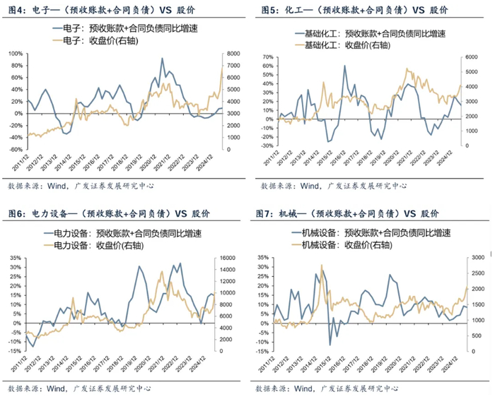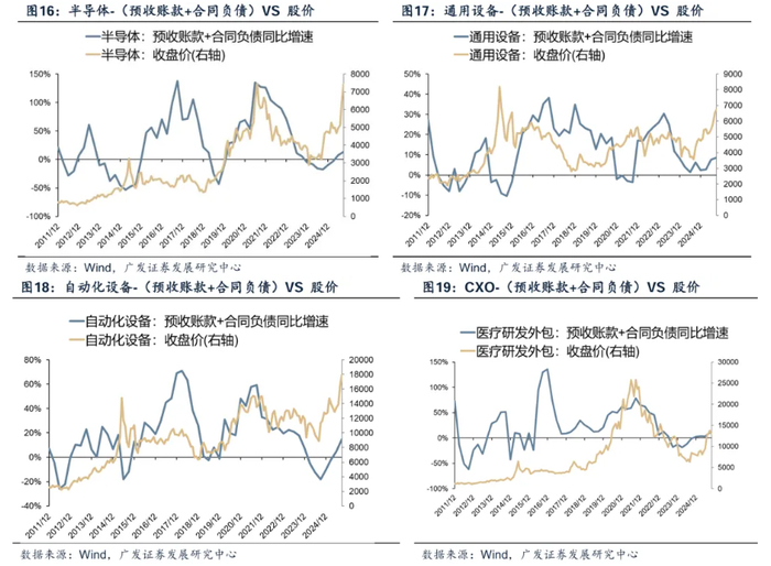 下图可见,一些典型制造业行业【预收账款+合同负债】同比增速与“收入增速”、“利润增速”、“股价表现”也存在正相关性。