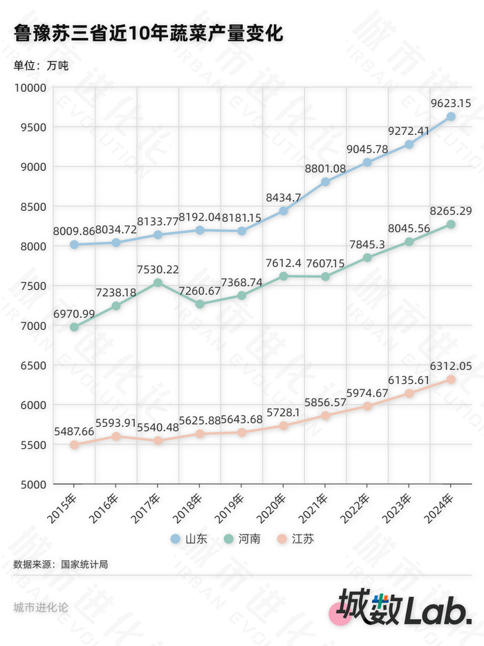数据显示,去年山东以9623.15万吨的蔬菜产量高居全国第一;同期河南蔬菜产量8265.29万吨,排名全国第二;江苏紧随其后,以6312.05万吨位列第三。