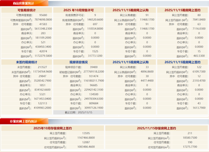 根据北京市住房和城乡建设委员会数据:11月15日,北京新房住宅网签75套,网签面积约9,426.5㎡;二手房住宅网签190套,网签面积约17275.77㎡。