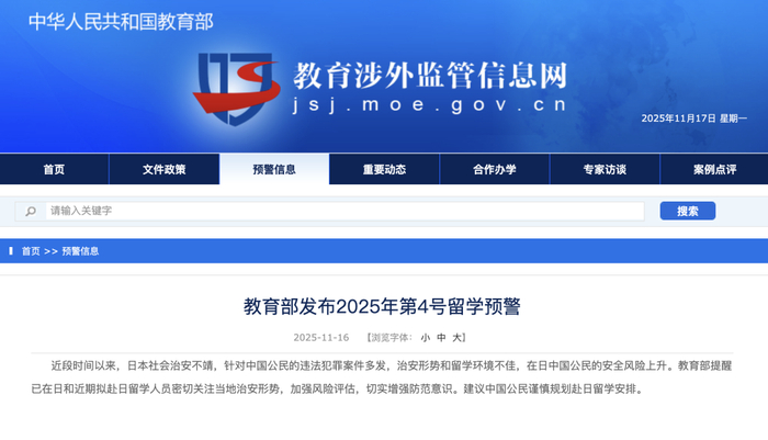 教育部也于同日发布2025年第4号留学预警,建议中国公民谨慎规划赴日留学安排。预警指出,近段时间以来,日本社会治安不靖,针对中国公民的违法犯罪案件多发,治安形势和留学环境不佳,在日中国公民的安全风险上升。