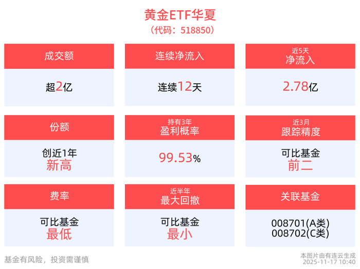 无惧调整,黄金ETF华夏(518850)连续12天净流入,累计吸金5.95亿元