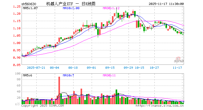 11月17日,截止午间收盘,机器人产业ETF(560630)跌0.09%,报1.058元,成交额373.79万元。机器人产业ETF(560630)重仓股方面,汇川技术截止午盘跌0.04%,科大讯飞涨1.12%,石头科技跌3.71%,大华股份跌1.64%,中控技术涨0.64%,大族激光跌0.16%,双环传动涨0.75%,科沃斯跌1.00%,机器人涨0.86%,云天励飞跌0.03%。