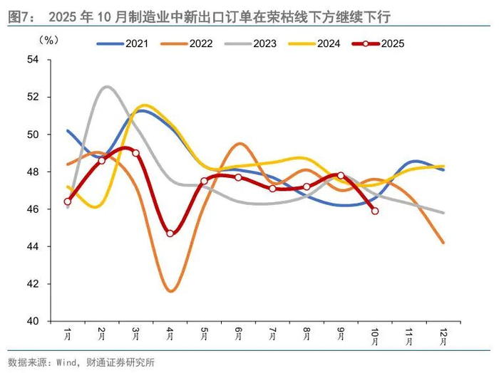 主线四:剔除基数影响,出口也在边际恶化。10月贸易摩擦升级,出口有压力,10月制造业中新出口订单读数为45.9%,处于2021年以来同期历史最低位水平,较9月在荣枯线下方继续下行,验证贸易摩擦下出口新订单承压。