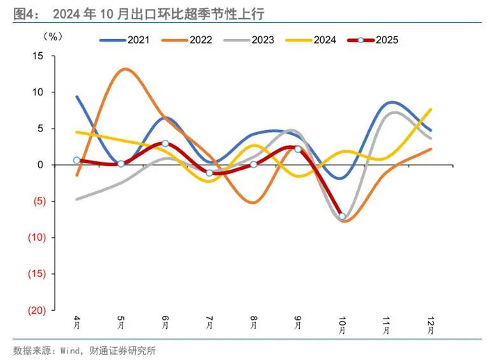 10月工业增加值当月同比4.9%,前值为6.5%。一是出口边际走弱掣肘了工业生产;二是高基数影响了同比读数,2024年同期受到924政策发力影响,制造业PMI生产指数自2024年10月至12月均保持在荣枯线上方,强于季节性水平;三是由于法定假期的安排以及“休三放十二”的拼假行为,有效工作日少于往年。