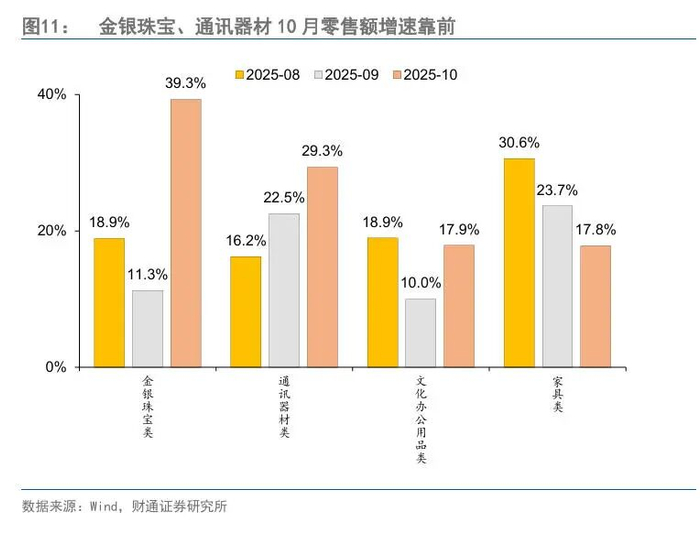 二是金银珠宝、通讯器材和文化办公用品类当月增速靠前。相对高增的品类包括金银珠宝、通讯器材、文化办公用品类和家具等,同比增速分别为39.3%、29.3%、17.9%和17.8%。
