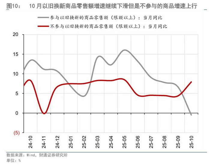 一是参与补贴的商品消费继续走弱,未参与补贴的商品消费走强。10月参与“以旧换新”补贴的商品零售同比增速从9月的6.7%下降至-0.5%,下滑7.2个百分点,而未参与补贴的商品零售增速上行3.6个百分点。补贴商品走弱可能受到补贴退坡和高基数双重影响,非补贴商品走强可能受到了部分平台双十一优惠提前开启、消费者付款前置的支撑。