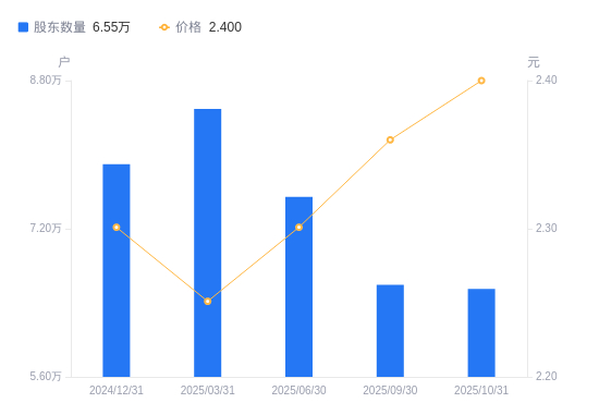 近一年(2024年12月31日至2025年10月31日),好当家A股股东户数从7.9万户,减低至6.55万户,降幅17.07%,区间股价上涨2.08%。