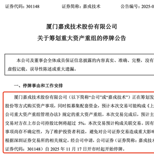 嘉戎技术表示,预计在不超过10个交易日的时间内披露本次交易方案。若未能在上述期限内召开董事会审议并披露交易方案,公司证券最晚将于12月1日开市起复牌并终止筹划相关事项。