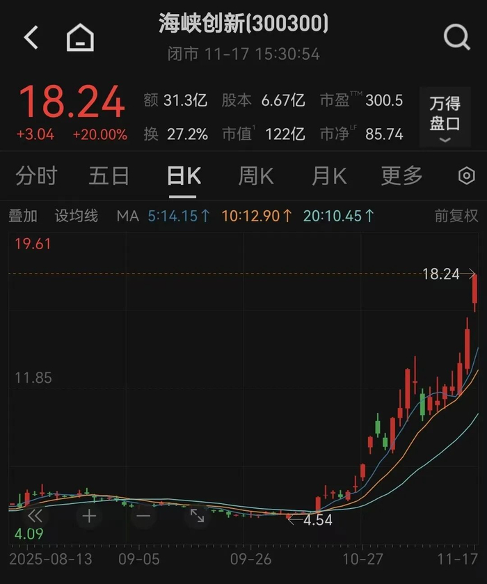 11月17日,海峡创新股价大涨20%,最新市值为122亿元。