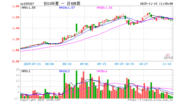 11月18日,截止午间收盘,创业板50ETF华夏(159367)跌0.26%,报1.534元,成交额158.68万元。创业板50ETF华夏(159367)重仓股方面,宁德时代截止午盘跌1.00%,中际旭创涨0.14%,东方财富涨0.08%,新易盛涨2.95%,阳光电源跌3.51%,胜宏科技涨1.23%,汇川技术涨0.36%,迈瑞医疗跌0.03%,亿纬锂能跌4.95%,同花顺涨0.97%。