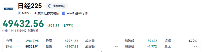 截至发稿,日经225指数下跌891.35点,跌幅1.77%。