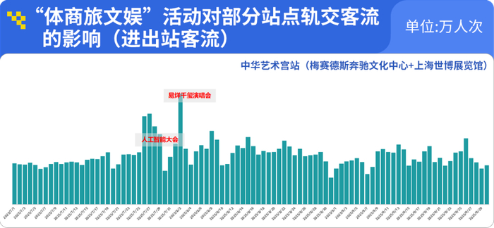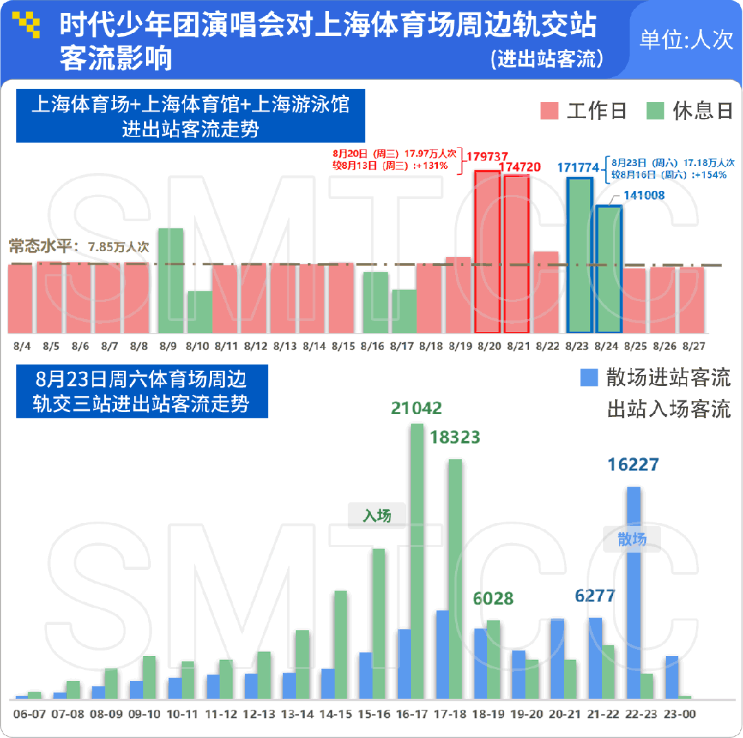 三季度体育赛事、场馆演出、大型会展等活动进入高峰,周边轨交站点客流持续增加。大型演唱会方面,因时代少年团“加冠礼”演唱会,自8月17日至24日上海体育场周边部分区域、道路实施了临时交通管控措施。期间,上海体育场、上海体育馆、上海游泳馆三站合计单日进出站客流最高近18万人次(8/20周三,叠加通勤客流),较常态(下图棕色均线为8/4-8/8均值7.85万人次)增长130%。详见下图: