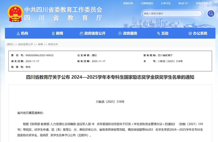 11月18日,四川在线记者从省教育厅获悉,2025年研究生学业奖学金和2024—2025学年本专科生国家励志奖学金的获奖学生名单在四川省教育厅官网公布。