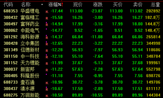 近日强势的锂电概念盘中大幅跳水,截至收盘,华盛锂电跌超17%,海科新源等跌超14%,信德新材、中一科技、天力锂能等跌超10%,石大胜华、天际股份、天赐材料、多氟多等跌停。