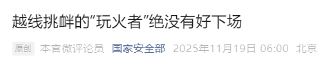 今天,国家安全部微信公众号发布评论员文章:《越线挑衅的“玩火者”绝没有好下场》,全文如下——